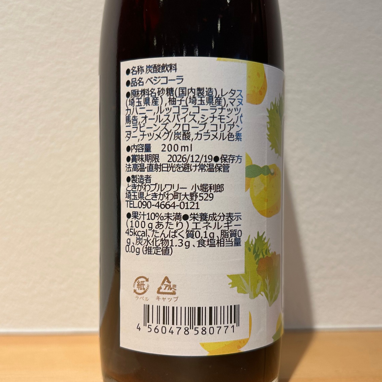 埼玉県の毛呂山町産の桂木ゆずとスマイル農場で生産した安心野菜(レタス3種とルッコラ)を使ったクラフトコーラ「ベジコーラ」です。
